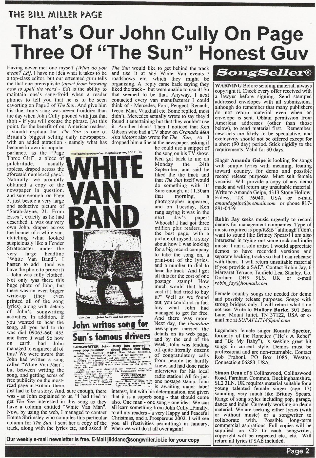Lead Vocal with 4 piece band "Flashback!" mostly 60's music..ideal for parties, school reunions. Looking for others to cover these songs, all written by me. What people have said about these tracks:- "Sheer Brilliance" - Jim Liddane ISA Chairman "Excellent song"- Scamp studios G.I.S.C "Very Good"- Richard Usher BBC Berkshire "Very Funny" (White Van Man) - Jonathan Hancock BBC Oxford "Excellent Groove + Hook" - Billboard "Really Digging White Van Man" - Blast 1386 radio "Next!" - X Factor Audition - (True!) "Eh?" - Beethoven "______ " - Marcel Marceau "Lets Book Him" - Basingstoke Police "Turn it down" - His Mum! "It'll be better in Stereo" - Van Gogh Please rate these songs, as this is the best way of knowing if I'm doing okay. Should you wish to Buy a CD of these songs "Out of Me Head" = 7.50 p Contact:- bigboycully@aol.com Mbl 07836 606160 Bio Left home at an early age, due to the handbrake on my pram not working..... My mothers advice to me on leaving,..."Put a clean pair of pants on everyday" ...by Sunday I couldnt get my trousers on! I removed the rear view mirror in my car, and have never looked back..... I used to dread the summer holidays, spending 6 weeks with my grandparents.....I hated that graveyard! Invented the worlds strongest acid, but I cant find anything to put it in!.. If it weren't for Venetian Blinds it would be Curtains for all of us!! Now In Ideal Job....tasting Lager and testing Mattresses able to combine both easily! Felt depressed, and tried to end it all by taking 200 aspirin....after the first 2 felt much better........... Samaritans Hung up on me.... Thought my maths teacher fancied me...she kept putting x's all over my work... Tried Stand Up comedy but people just laughed at me... The guy that was on before me was so-o bad they were still boo-ing when I was on. Not sure what to do, might be a Gynaecologist again..I like to keep my hand in!..... I went to the Library yesterday I said "Have you got any books on shelving?"...she said "They all are!" Was going to go on a assertiveness course but I couldnt be arsed... Had a Penis extension........makes the house look strange though! The U Bend on a toilet.....cant get my head around it What do you guys think about schizophrenia?, I'm in two minds about it Black Beauty.....A dark horse that one To all you Virgins out there.....thanks for nothing! Have found next weeks Lottery ball draw results!!! they are from left to right as follows lowest number first:-